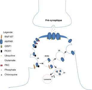Modèle d’étude de la voie de régulation de l’expression postsynaptique des récepteurs AMPA. Les récepteurs AMPA (AMPAR) sont stabilisés au niveau de la PSD par les protéines GRIP1. Une liaison des neurotransmetteurs glutamates permet une diffusion latérale des AMPAR. La sérine S880 de la sous unité GluA2 est phosphorylée par la PKC. Cette modification augmente l’affinité de la protéine PICK1. Au niveau des vésicules d’endocytose (VE), les sous unités des AMPAR sont ubiquitinées par la UBE3 ligase RNF167. Suite à l’endocytose, les récepteurs AMPA se retrouvent dans les endosomes précoces (EP). Une perte de l’ubiquitination permet le recyclage membranaire des récepteurs via les endosomes de recyclage (ER). Les AMPAR ubiquitinés seront envoyés à dégradation lysosomale via les endosomes tardifs (ET).